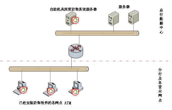 根据ATM的防御特性,亚信安全提出了以下自助机具深度防御架构体系,部署在总行数据中心的自助机具深度防御系统服务器和各ATM上部署的客户端程序。