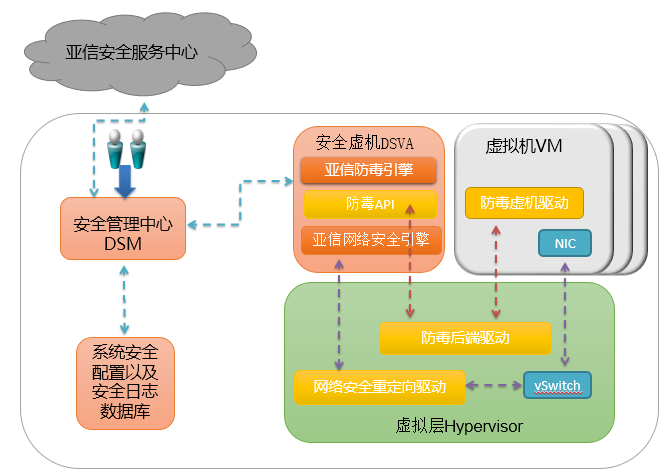 通过部署虚拟化底层的无代理防护体系,亚信安全对虚拟环境提供全新的信息安全防护方案——DeepSecurity,通过病毒防护、访问控制、入侵检测/入侵防护、虚拟补丁、主机完整性监控