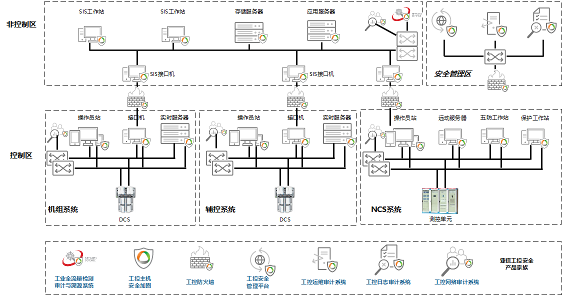 生产控制大区各个安全域,如:机组DCS、辅控系统、NCS、SIS系统,旁路部署工控流量审计设备,对各个系统进行全流量审计分析,实现资产管理、漏洞管理,掌握工控流量内容,及时发现工控异常操作、协议异常、非法接入、非法外联等。